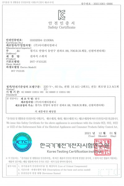 [전기안전인증서] INT-F1012S 외 파생모델 (21.12.01)