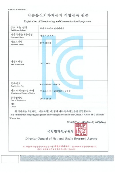 [방송통신기자재등록필증] INT-1042S 외 파생모델 (19.08.09)